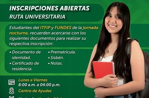 Posted in flandes ¡Atención jóvenes flamencos! Ya están abiertas las inscripciones para la Ruta Universitaria. Author: ghnoticias Published Date: 13 enero, 2026 Estudiantes del ITFIP y FUNDES (jornada nocturna) deben acercarse al Centro de Ayudas con los siguientes documentos: Documento de identidad, prematrícula, Sisbén, notas y certificado de residencia. Plazo máximo: miércoles 14 de enero ¡No dejes pasar esta oportunidad! #UnidosTransformamosFlandes Author: ghnoticias