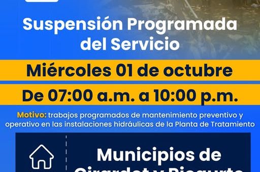 El próximo miércoles 1 de octubre se llevará a cabo una suspensión programada del servicio de agua en ambos municipios.