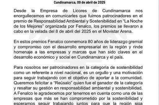 La Empresa de Licores de Cundinamarca fue patrocinador en el premio de Responsabilidad Ambiental y Sostenibilidad en “La Noche de los Mejores” organizada por Fenalco.