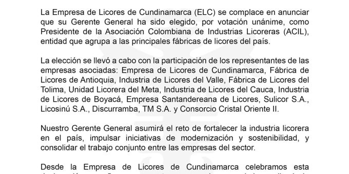 Posted in Nacional Gerente de la Empresa de Licores de Cundinamarca elegido presidente de ACIL. Author: ghnoticias Published Date: 28 marzo, 2025 Nicolás Forero fue elegido por unanimidad como presidente de la Asociación Colombiana de Empresas Licoreras ACIL. Ver estadísticas y anuncios Promocionar publicación Todas las reacciones: 11