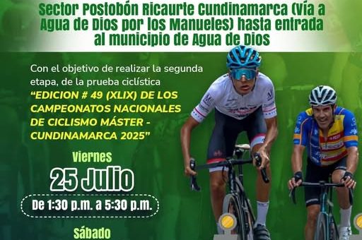 La Alcaldía de #Ricaurte informa a toda la comunidad que, con motivo de la realización de los Campeonatos Nacionales de Ciclismo Máster Cundinamarca, se realizará cierre total de vía en el sector comprendido entre las veredas Manuel Sur y Manuel Norte, hasta la entrada del municipio de Agua de Dios.